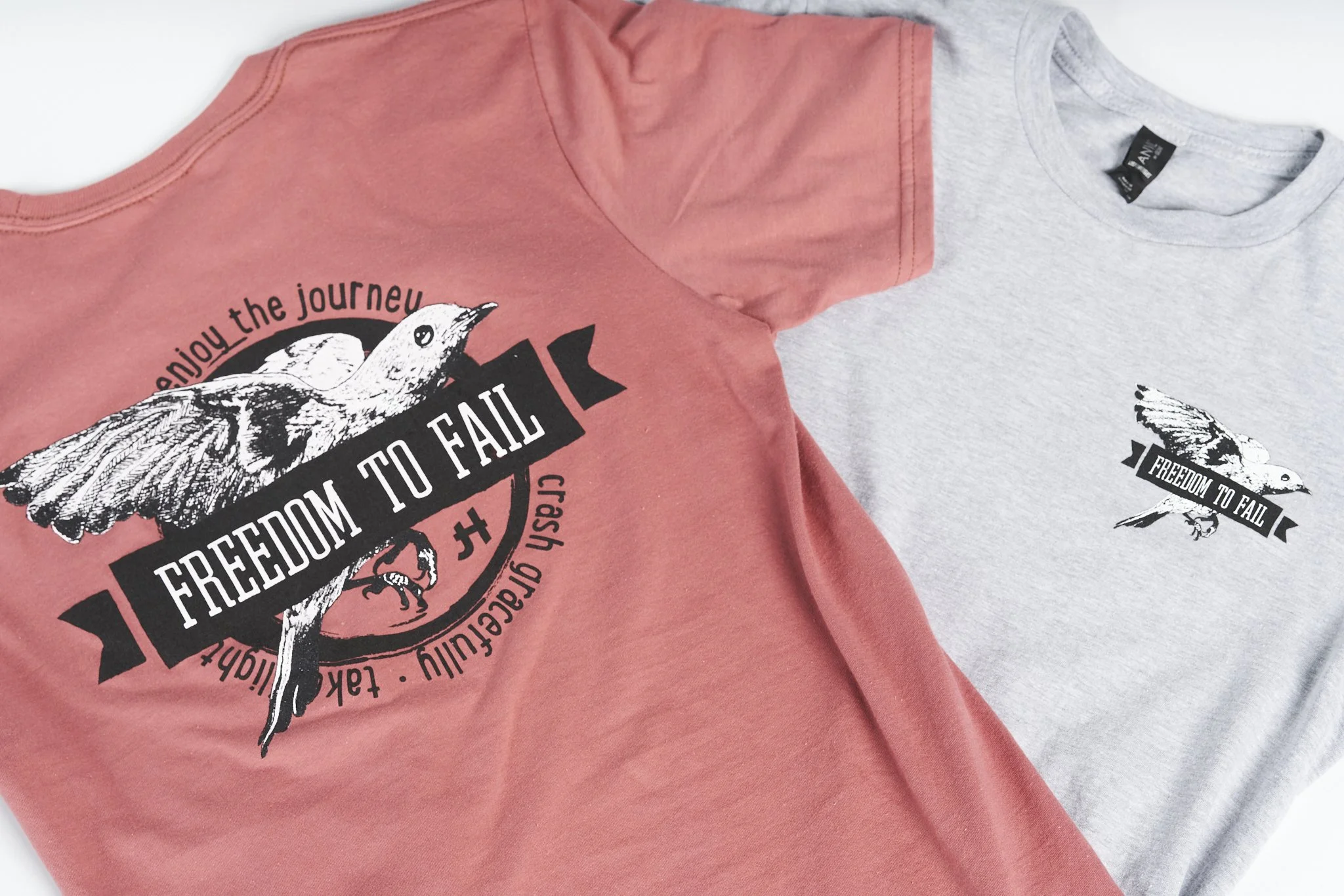 The front chest placement keeps the mark intimate and personal. The back print expands the story. "Enjoy the journey, crash gracefully, take flight." It turns the shirt into something closer to a manifesto than merchandise.