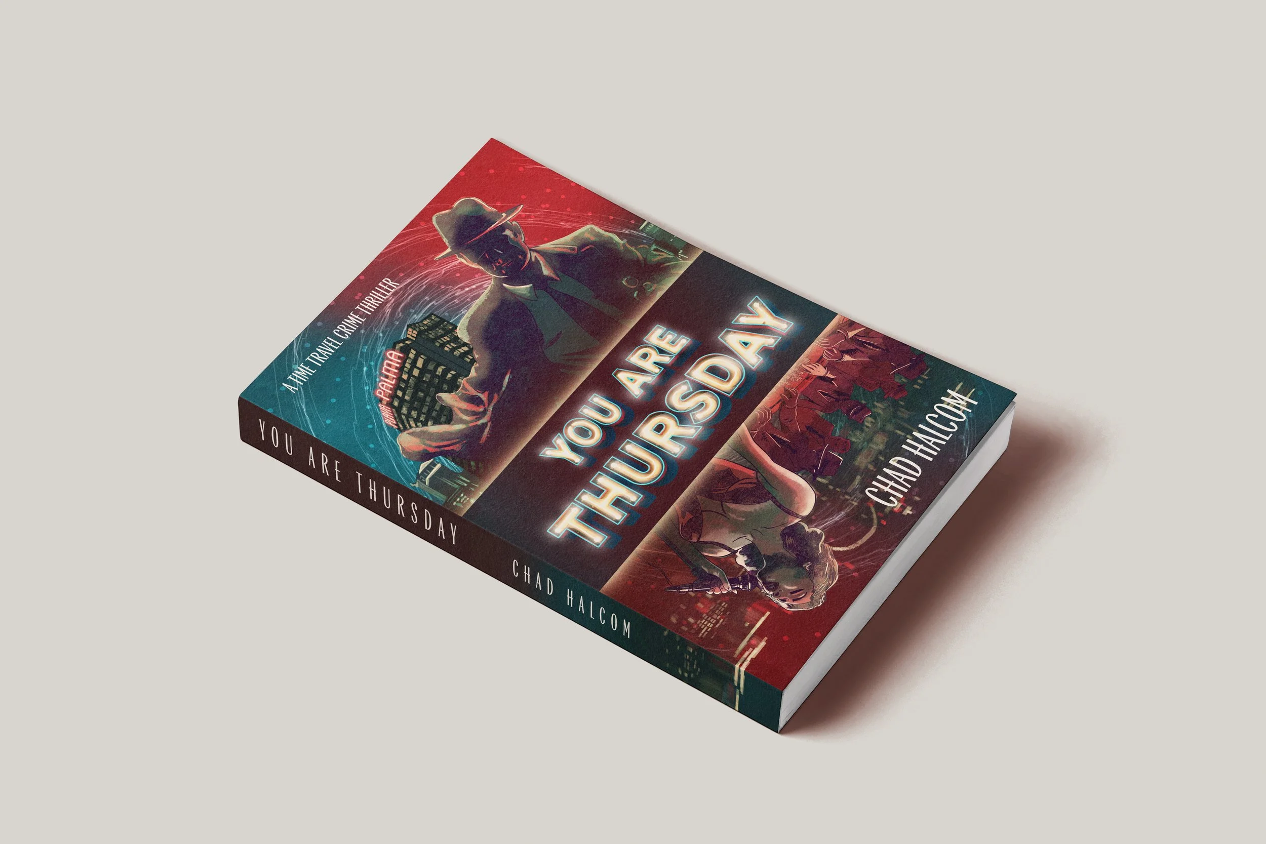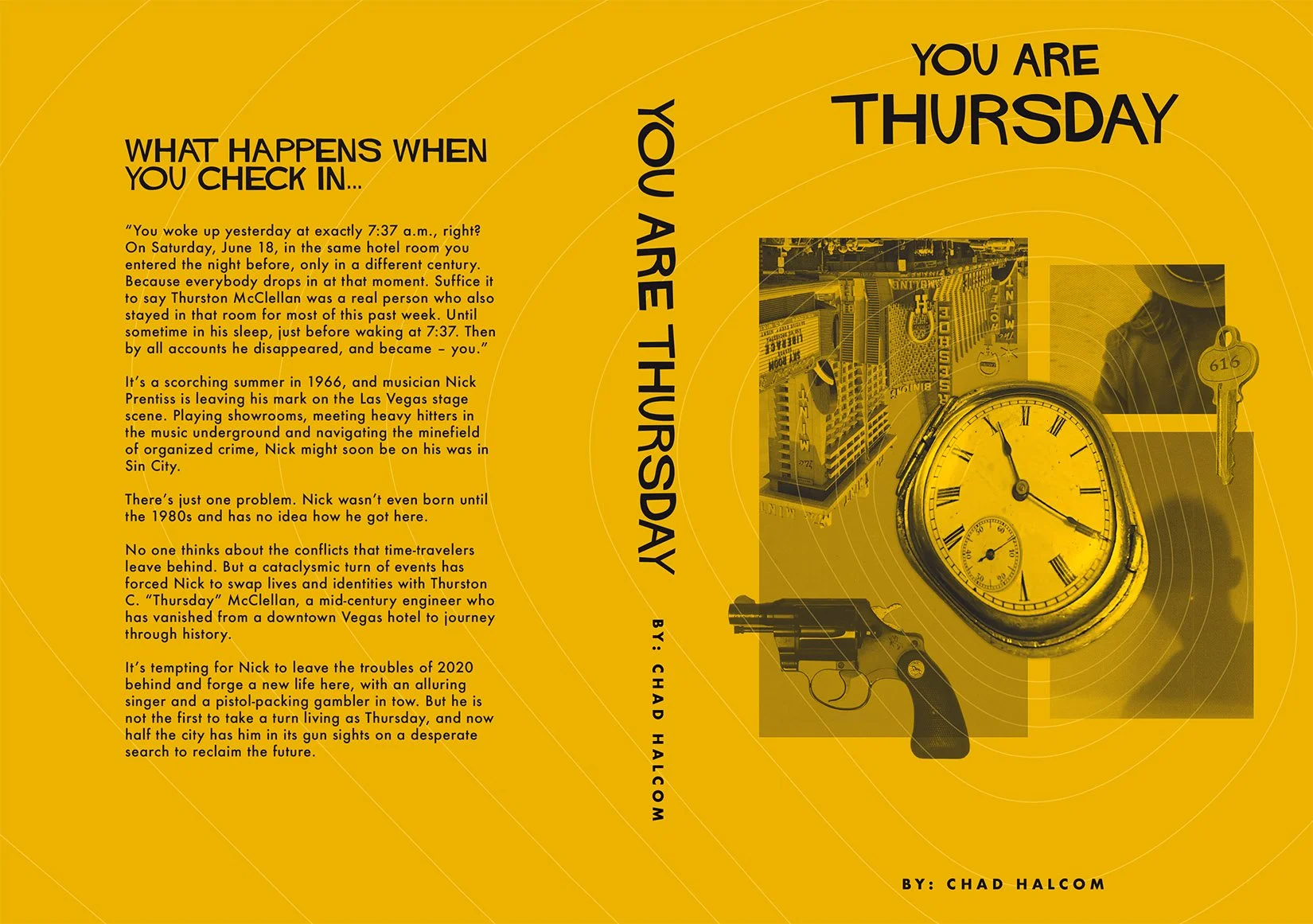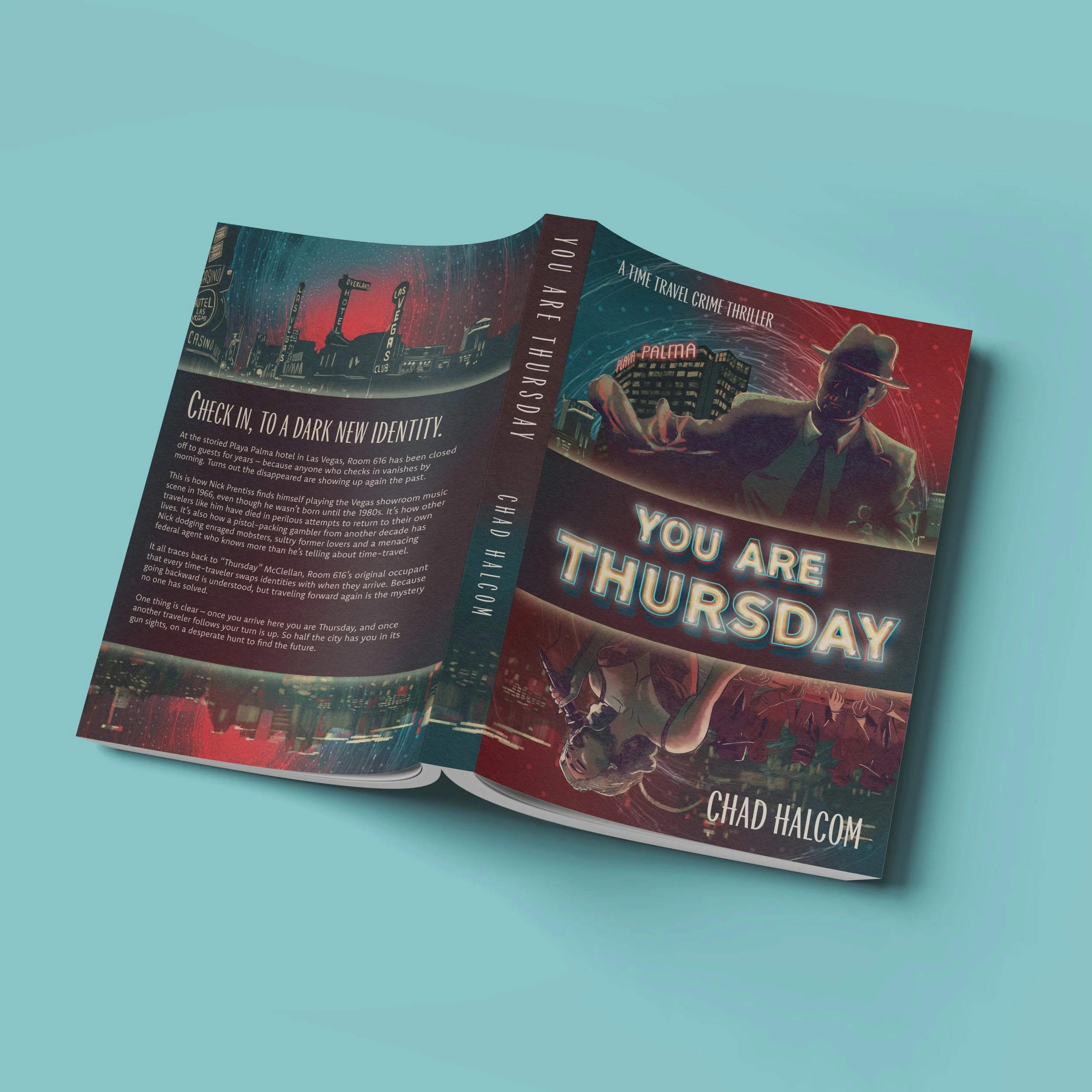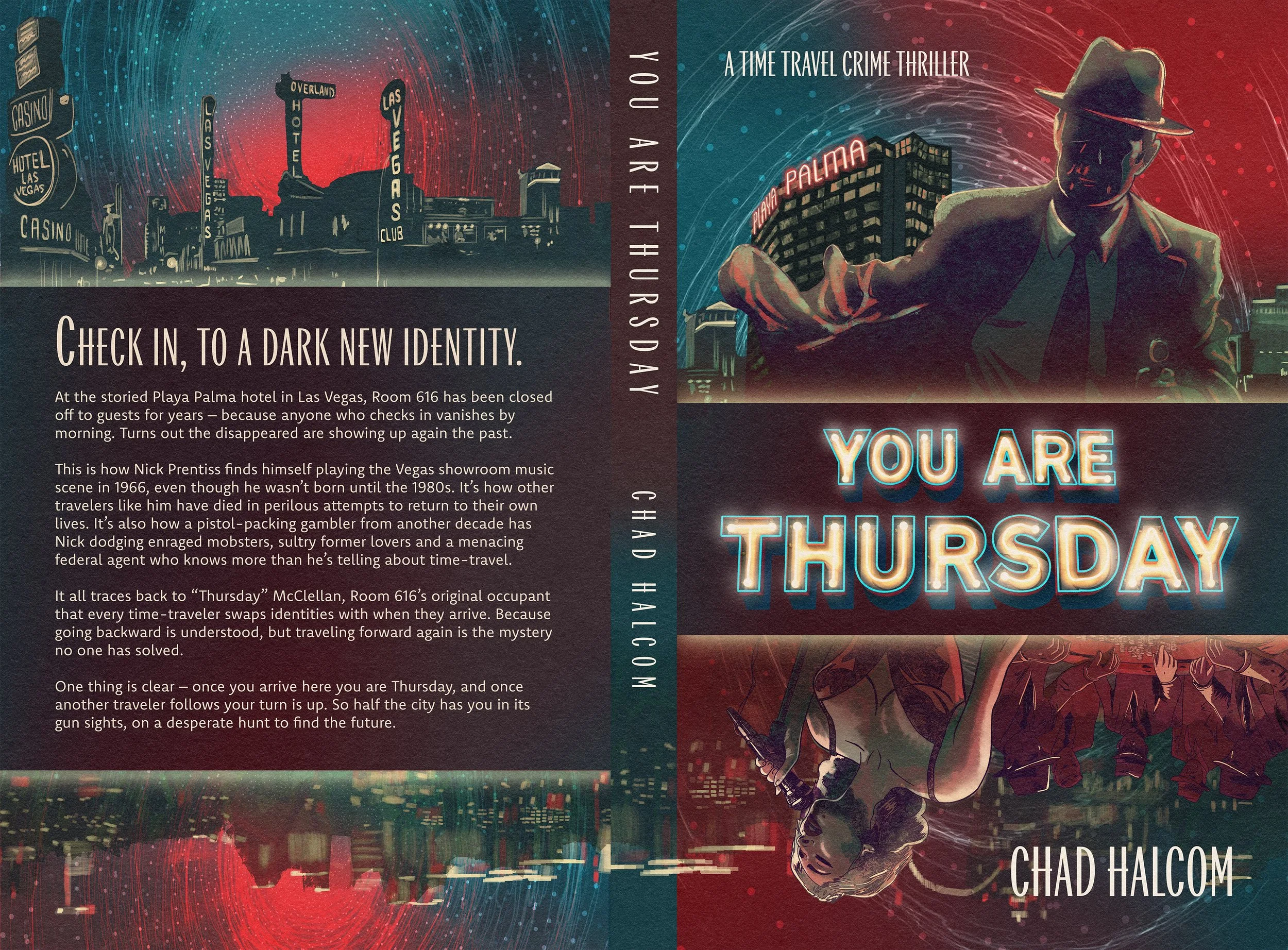 You Are Thursday is a time travel crime thriller by author Chad Halcom, set against the glamour and danger of 1960s Las Vegas. Halcom came to me with an existing cover that wasn't landing the right tone. The goal was a ground-up redesign that communicated the genre and era immediately, while capturing something more specific: the feeling of a world that looks familiar but is slightly, unsettlingly wrong.